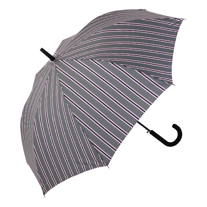 風に強いグラスファイバー骨のメンズジャンプ傘です。強風で傘がひっくり返っても簡単にもとに戻る構造です。おしゃれなストライプ柄で傘生地は超撥水仕様、手元はフィット感抜群のラバー仕様になっています。親骨サイズは大型65cmです。